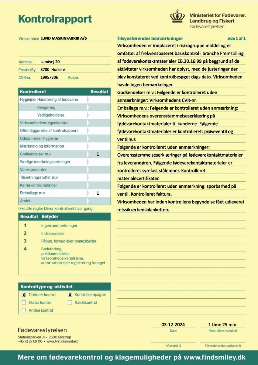 Vi er stolte over igen i år at være blevet godkendt af Fødevarestyrelsen uden anmærkninger.